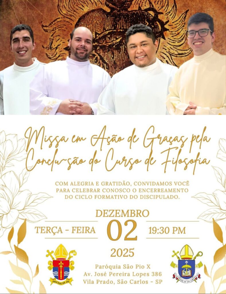 Com alegria, anunciamos a celebração que marca o encerramento do ciclo formativo do discipulado dos nossos seminaristas.Um momento especial de gratidão a Deus pelo caminho percorrido, pelo estudo, pela maturação vocacional e pelo serviço já vivido nas comunidades. A missa acontecerá no dia 02 de dezembro, às 19h30, na Paróquia São Pio X, em São […]
