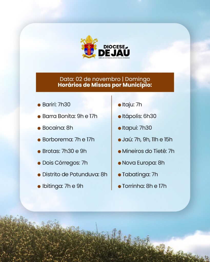 A Diocese de Jaú divulgou os horários das celebrações de Finados, que serão realizadas no domingo, dia 2 de novembro de 2025, em todos os municípios que compõem a Diocese.