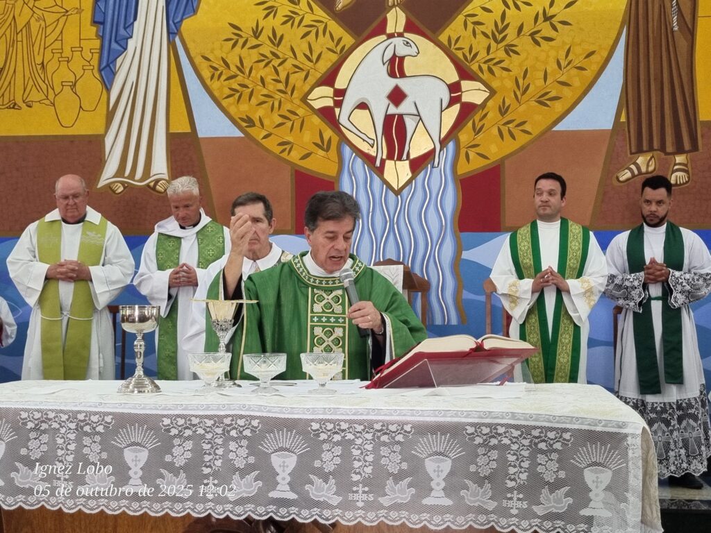 A Santa Missa, foi celebrada pelo padre Celso e concelebrada pelos padres Evérson do Prado (que hoje se despediu da nossa Paróquia e segue para Bariri); padre Renato Siviero, que será empossado em breve, como administrador paroquial da Quase-Paróquia Santa Luzia, a ser desmembrada da nossa Paróquia Divino Espírito Santo; padre José Carlos Frederice, hoje em Barra Bonita, e que há 13 anos, como pároco da Divino Espírito Santo, de Dois Córregos, deu início à reza do Terço dos Homens em nossa comunidade, e perseverou junto com os homens, que nem durante a pandemia, deixaram de se reunir, espalhados pela praça da Matriz, para rezarem por todos nós; e o padre Conrad, um polonês simpático e sorridente, pertencente a Comunidade Cenáculo (aqui em Dois Córregos a Comunidade São Lourenço).
