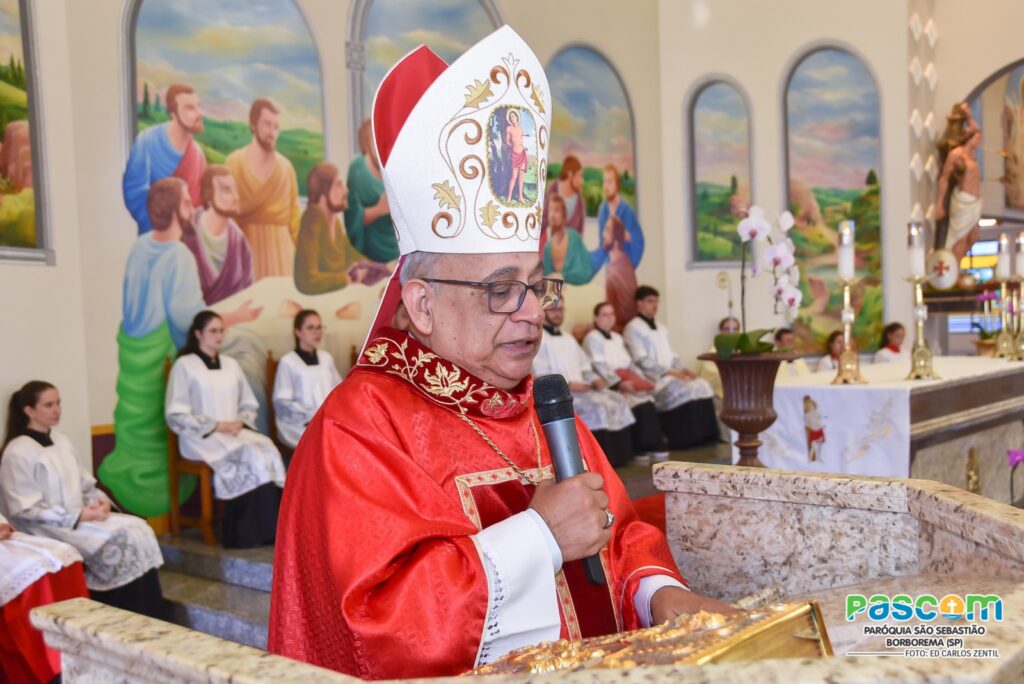 Ao retornar à Igreja Matriz, Dom Francisco acolheu solenemente a imagem de São Sebastião, juntamente com a relíquia de primeiro grau, que contém um pequeno fragmento do osso do santo, conduzindo a assembleia a um momento de veneração e oração.